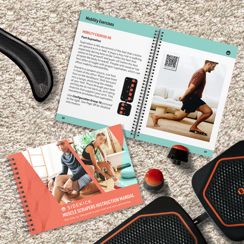 Locate your injury in the printed guide and follow the mobility + strength routines step-by-step.